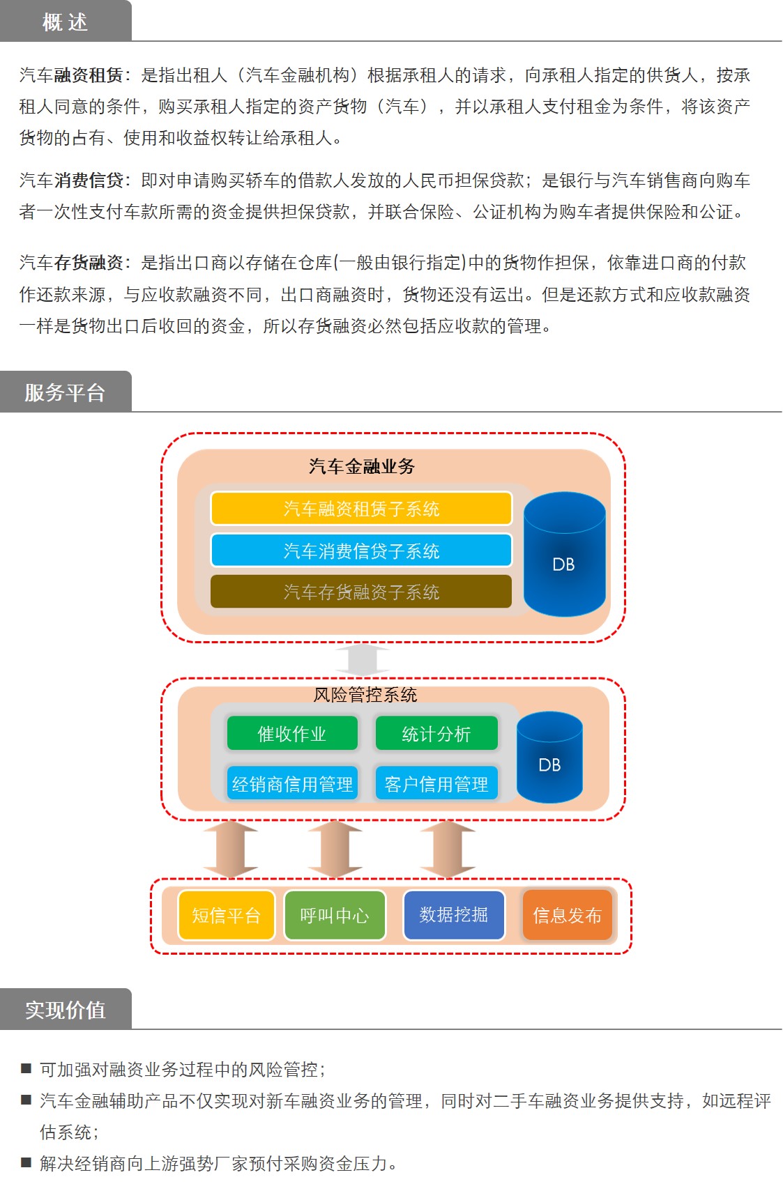 為汽車金融服務機構提供消費信貸、融資租賃、存貨融資等管理。